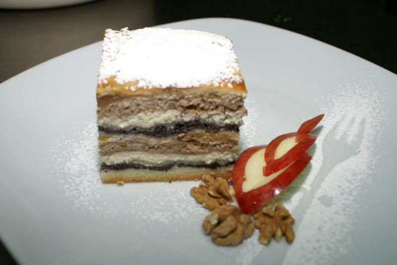 Priprava: Iz sestavin za krhko testo umesimo krhko testo, iz sestavin za vlečeno pa vlečeno testo. Krhko testo razvaljamo, in damo v namaščen pekač. Posipamo z makom in sladkorjem, ter polijemo s polivom. Pokrijemo s plastjo vlečenega testa, dodamo skutni nadev in spet pokrijemo s plastjo vlečenega testa. Nato posipamo orehe in sladkor, ter polijemo s polivko. Pokrijemo s testom in dodamo naribana ali grobo narezana jabolka in sladkor. Postopek z nadevi plastmi vlečenega testa ponovimo še enkrat. Na koncu damo dvojno plast vlečenega testa, prelijemo s polivom (smetana + jajce, da se lepo zapeče) in pečemo v prej ogreti pečici, slabih 120 minut na 200 stopinjah.