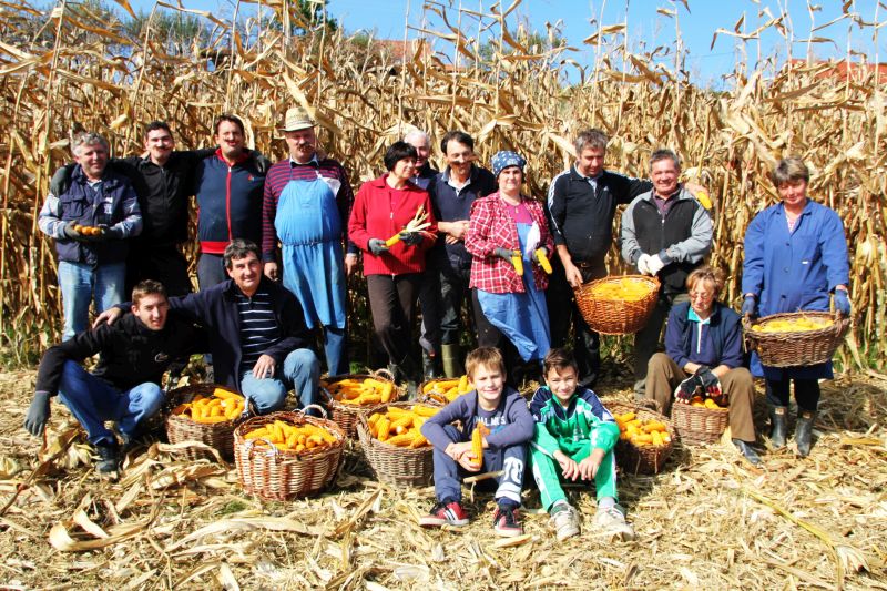 In zbrala se je vesela družba. Izpolnili so dvojni namen, potrgali so koruzo in se družili. „Oboje gre danes v pozabo. Mnogi, ki so se odzvali povabilu, so celo prvič trgali koruzo. To delo pa je zanimalo tudi mlajše, ki so pridno pomagali pri delu. V preteklosti smo koruzne storže, mi tečemo late, le potrgali in jih vozili na kmečko dvorišče, naton ali »gümlo«, če so jo imeli. Storže smo nato lüpali ali ličkali ob večerih. Tudi to je bilo veliko druženje, po navadi smo po končanem delu, ob melodiji harmonike ljudskega godca, zaplesali. Včasih smo koruzne late vezali v snope in jih obešali pod napušči hiše ali gospodarskega poslopja, da se je koruza posušila. Danes jo spravljamo v koruznik, kjer se suši na zraku“, je še povedal gospodar Franci.