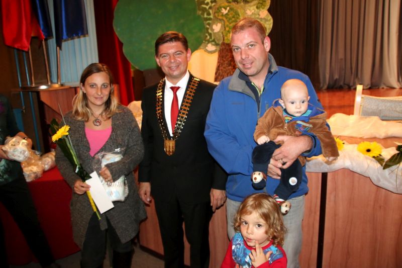 Po končanem kultnem delu prireditve, je voditeljica Maja Fridau na oder povabila župana občine Darka Frasa, ki je v kratkem nagovoru pozdravil starše in vse navzoče v dvorani in ob tem med drugim dejal: »Letos smo po številu rojenih otrok dosegli rekord, saj še doslej v vsem času, kar prirejamo sprejeme, nismo dosegli takega števila. Tega smo v občini veseli. Naša naloga pa je, da otrokom in staršem pomagamo zagotoviti prostor v vrtcu in tako poskrbeti za rast in razvoj otrok. Zavedamo pa se, da je glavna skrb za otroke pri starših, vendar tudi družba mora prispevati svoje, da olajša življenje družinam z otroki. Storili bomo vse, da bo za vse prostor v vrtcu, da bodo lahko starši svoje otroke, če bodo želeli, dali v varstvo v vrtec. Tudi današnji sprejem je nekaka pozornost tem otrokom in staršem. Prispevek, ki ga občina v ta namen prispeva za rojenega otroka, to je 180 evrov, je le majhna pomoč družini, ki jo namenja občina ob rojstvu otroka.« Nagovor je župan sklenil z besedami: » Dragi starši! Želim vam veliko lepih trenutkov pri vzgoji in skrbi za naraščaj in da bi bili otroci in starši zdravi, ter se veselili družinskega življenja.«. Prireditev so zaključili s podelitvijo »belih ovojnic« z omenjenim prispevkom občine in rožico, ter priložnostnim darilom. To nalogo sta tokrat opravila župan Darko Fras in podžupanja Zdenka Polanec, ki sta vsakemu staršu čestitala za njihov veseli družinski dogodek. Zanimivo je, da je med 31 otroci tudi družina z dvojčki. To sta 2 meseca stara Nia in Lana, staršev mame Doroteje Roškar in očeta Roka Pauriča, iz Zg. Senarske.